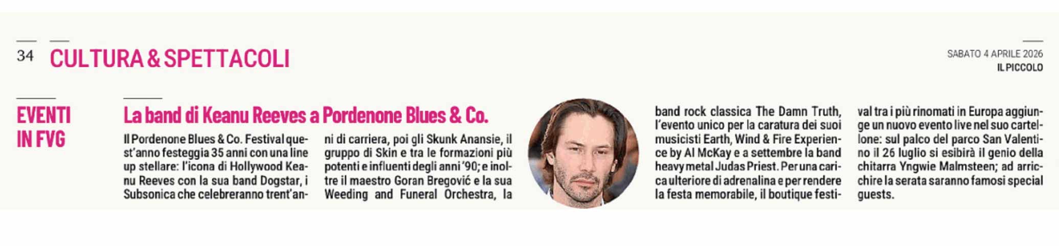 Il Pordenone Blues & Co. Festival quest’anno festeggia 35 anni con una line up stellare: l’icona di Hollywood Keanu Reeves con la sua band Dogstar, i Subsonica che celebreranno trent’anni di carriera, poi gli Skunk Anansie, il gruppo di Skin e tra le formazioni più potenti e influenti degli anni’90; e inoltre il maestro Goran Bregović e la sua Weeding and Funeral Orchestra […]